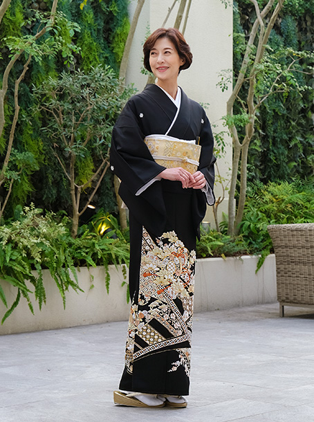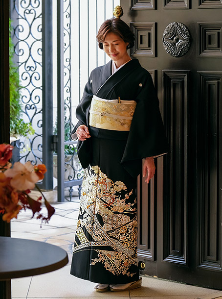 落ち着いた黒地に四季の彩りが映える華やかな留袖です。上質な手仕事の美しさが写真にもよく映え、お母様の品格を引き立てます。ホテル・神前式など格式の高い場にもおすすめです。