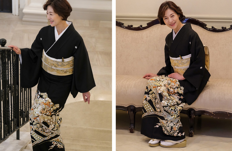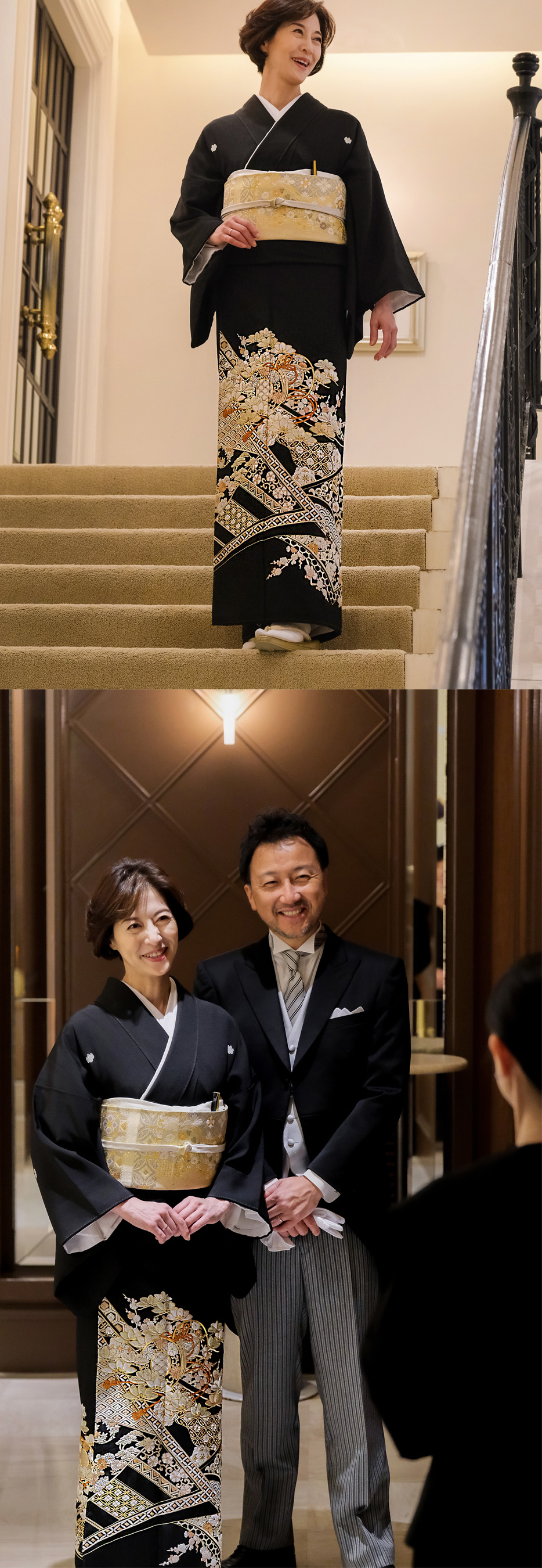 落ち着いた黒地に四季の彩りが映える華やかな留袖です。上質な手仕事の美しさが写真にもよく映え、お母様の品格を引き立てます。ホテル・神前式など格式の高い場にもおすすめです。