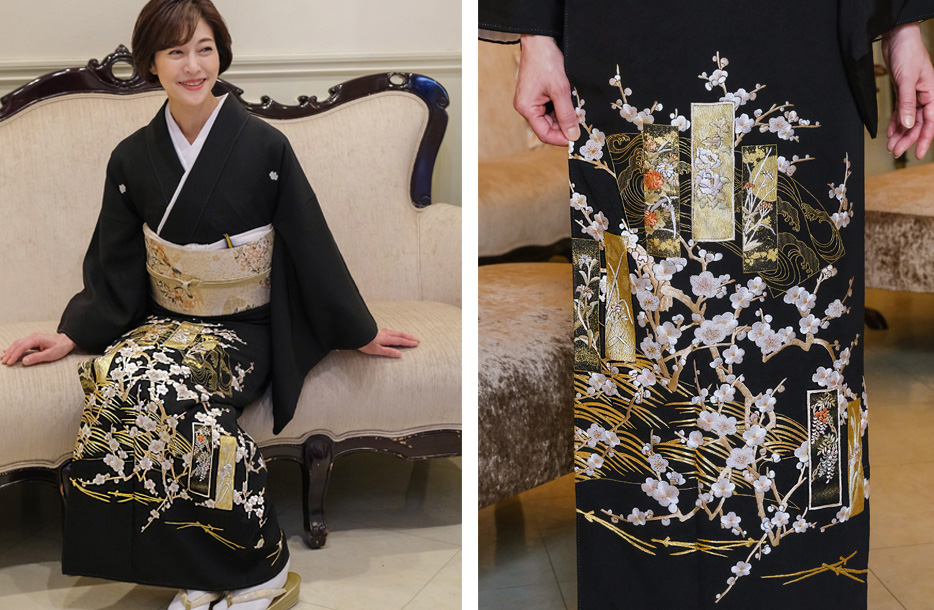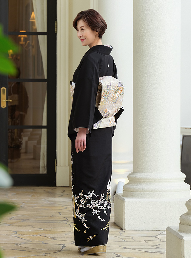 漆黒の地に咲く白梅を主体に、金彩の短冊や牡丹・菊・藤など四季の花々を手刺繍で丁寧に表現した一着。白梅の清らかな佇まいが気品を宿し、凛とした美しさを演出します。