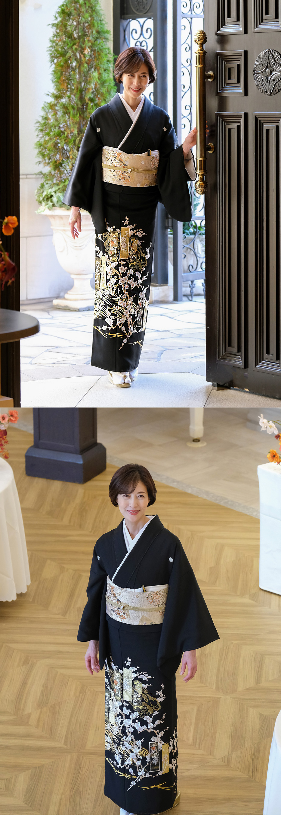 白梅の象徴的な美しさと金彩の華やかさを併せ持つ留袖です。写真にも映える明瞭な意匠で、ホテルウェディングや格式ある挙式にもよく似合う品格ある一着となっています。